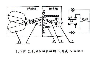 結(jié)構(gòu)原理: UQK型浮球液位控制器由互為隔離的浮球組和觸頭組二大部分組成。 當(dāng)被測液位升高或降低時,浮球1隨之升降,使其端部的磁鋼2上、下擺動,通過磁力作用,推斥安裝在外殼3內(nèi)相同磁極的磁鋼4上、下擺動,其另一端的動觸點5便在靜觸頭1-1及2-2間連通或斷開。