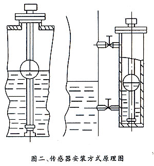 3、傳感器在被測(cè)容器上,其安裝方法見圖二,傳感器下端較好與容器底部固定牢。